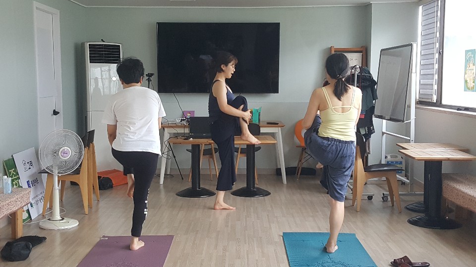 태양경배자세 및 스탠딩요가동작과 싯팅요가동작을 하였습니다.