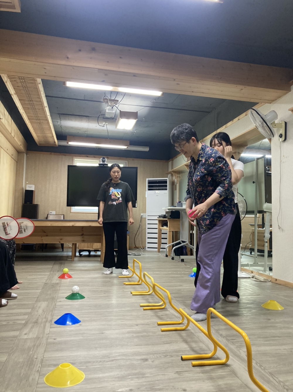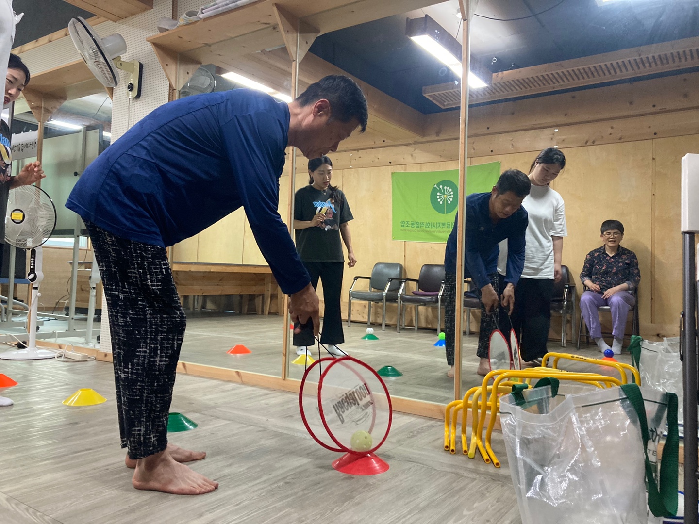 상체 균형 운동, 집중력을 요구하는 꼬깔 위 공을 라켓으로 옮기기, 스트레칭